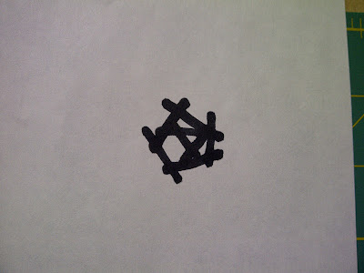 first of all make 3 long stitches in a rough triangle shape, and with overlapping corners.Next make a ring of stitches around the triangle, crossing the corners and building up more sides...